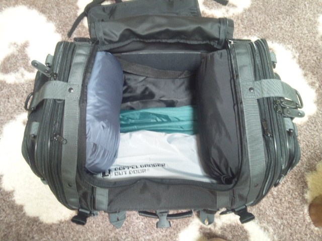 ミニテーブル、テント、寝袋、レインウェア、あぐらイスも試しに一緒に収納。