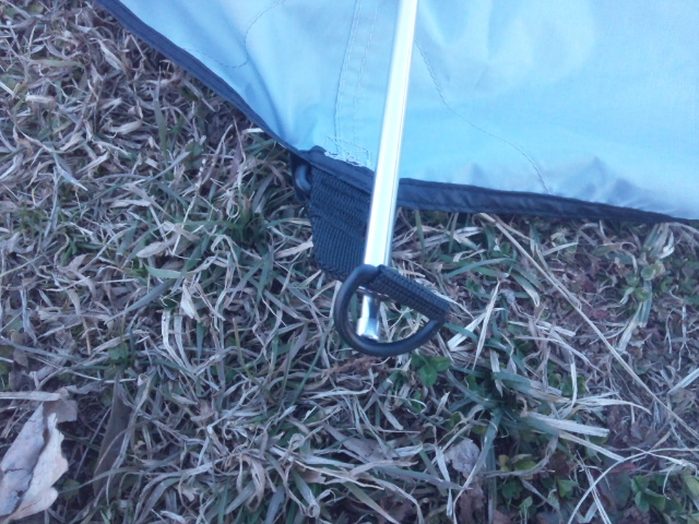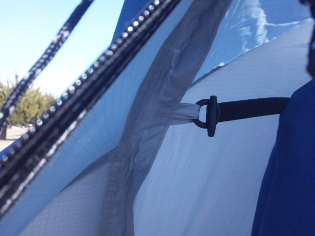 次に、テントの外側にフックが8箇所位あるので、そのフックに内側を留めていきます。