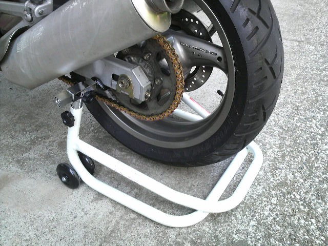 とりあえず、リアスタンドを使用して後輪を上げます。