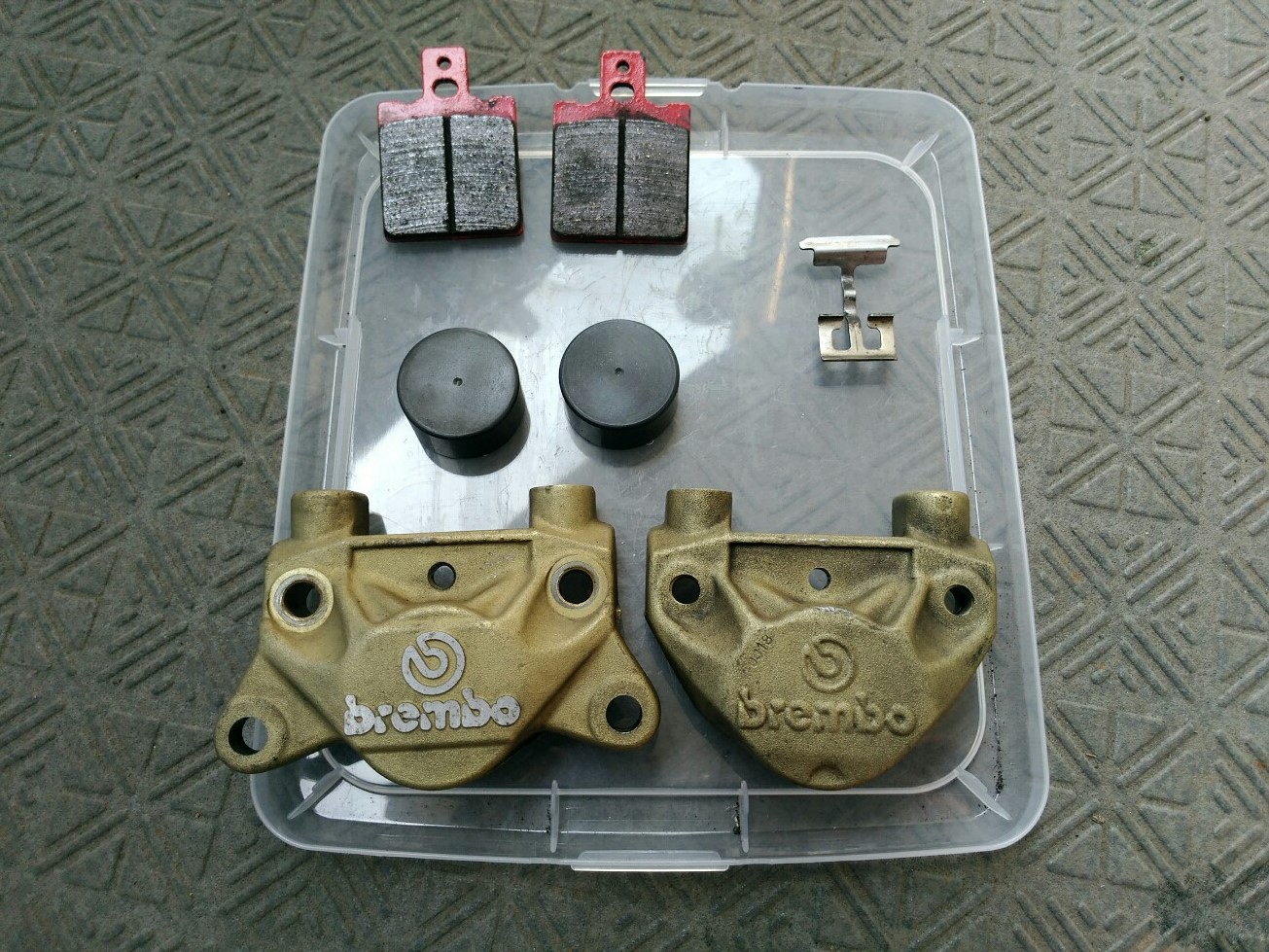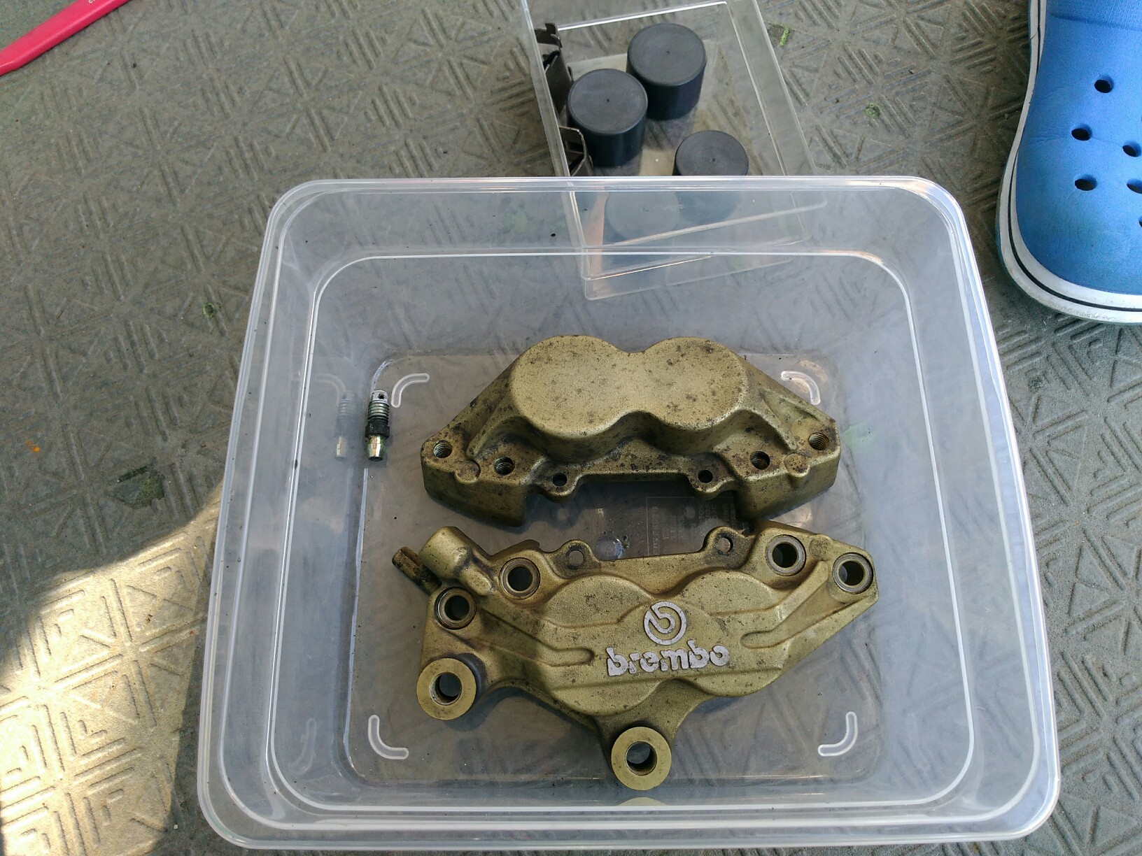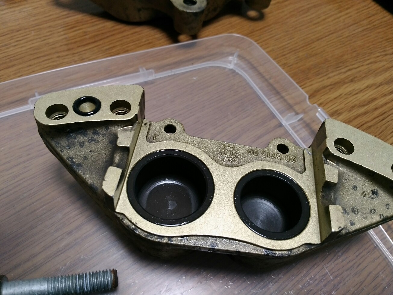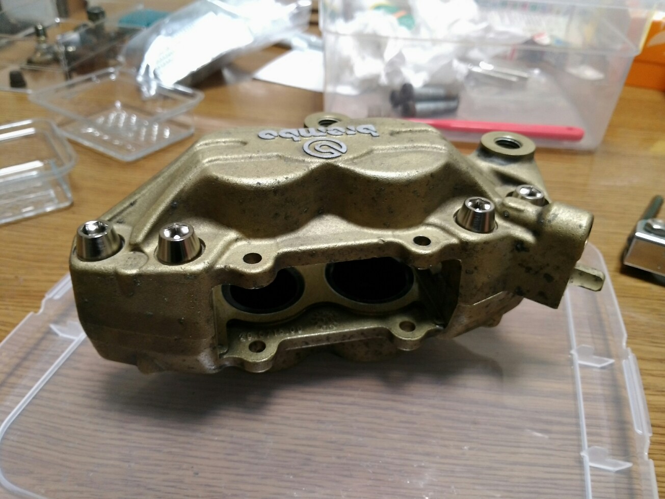 昨日取り外したリアブレーキキャリパーの分解、清掃、組み立てです。