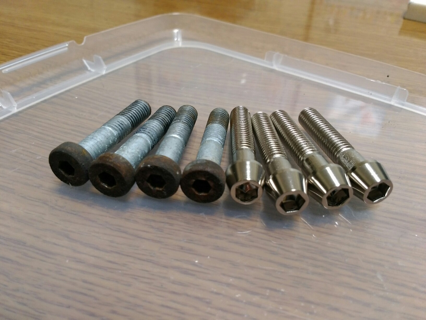 これをチタンボルトに変えたいところですが、フロントだけで6千円を超えてしまいます。
