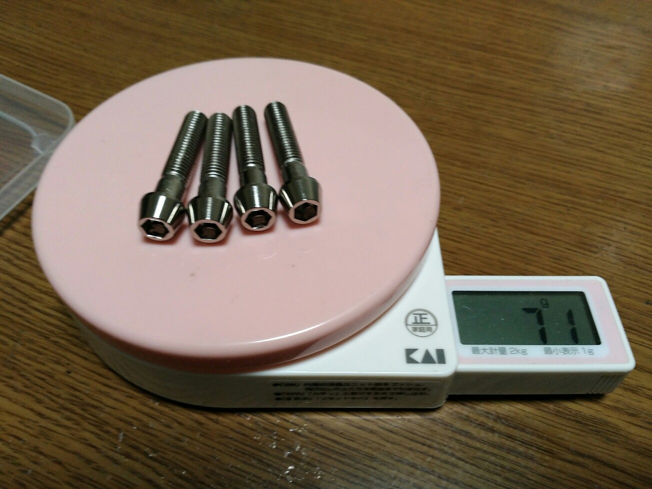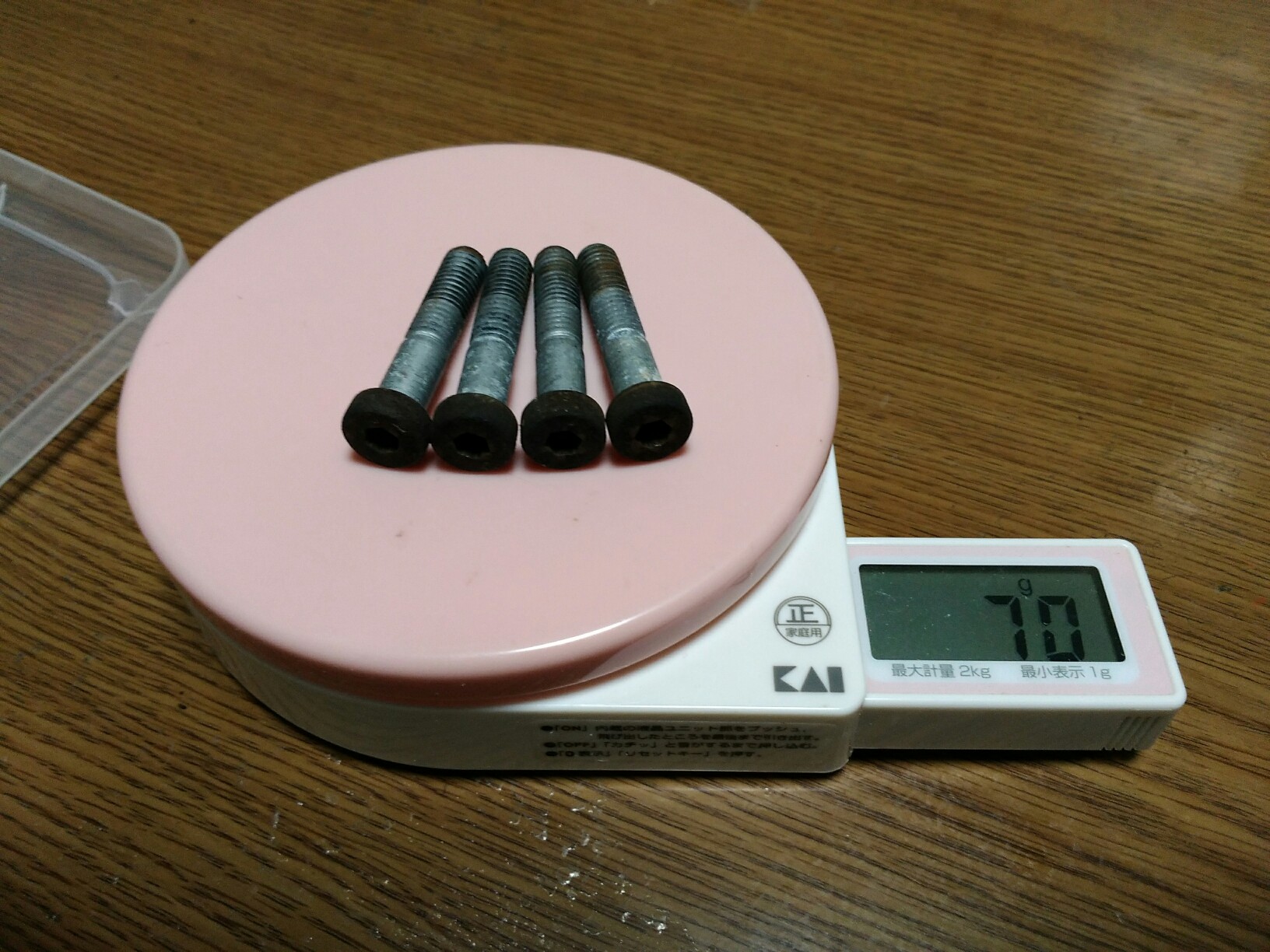 チタンボルトじゃないので軽くなっていないと思うけれど、重量を計ってみると、