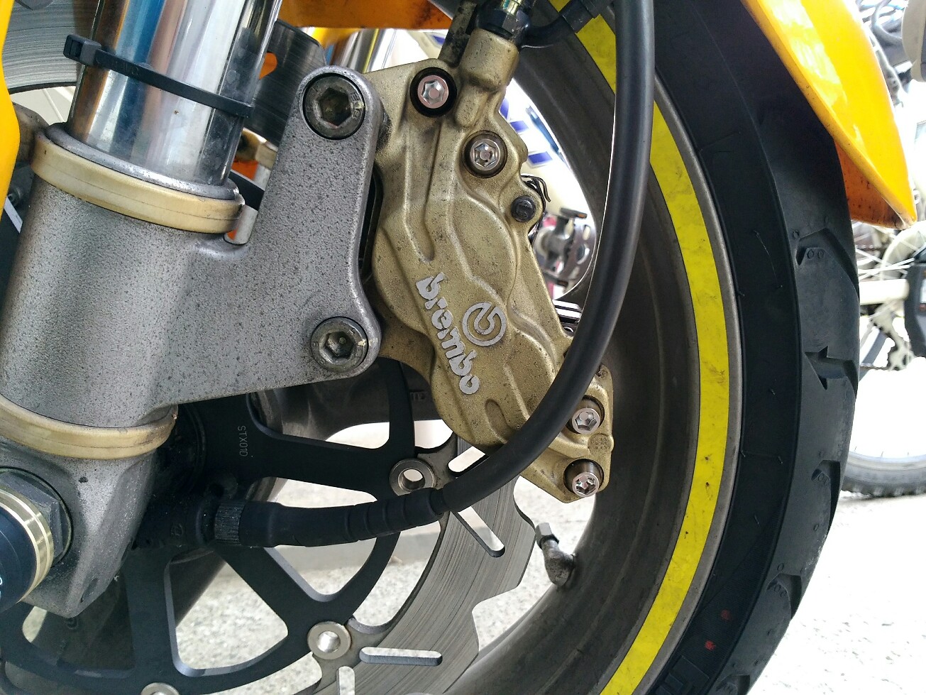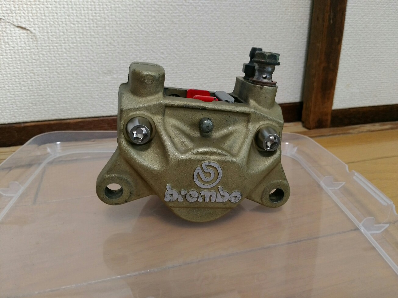昨晩組み立てたフロントブレーキキャリパーを取り付けました。