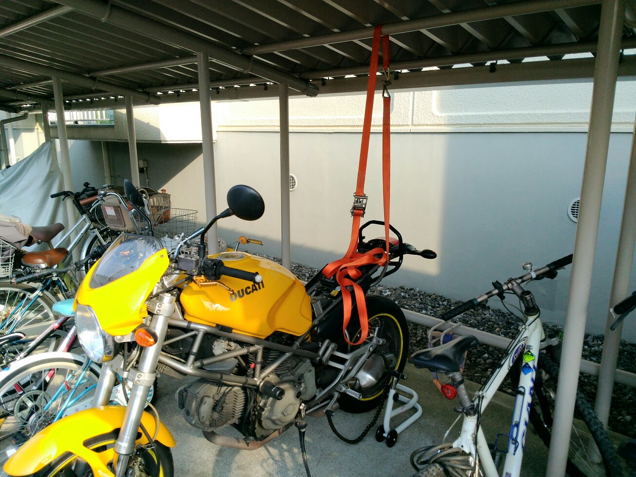 自転車置き場の屋根の骨組みのパイプにベルトを通して、ラチェットで吊り上げました。