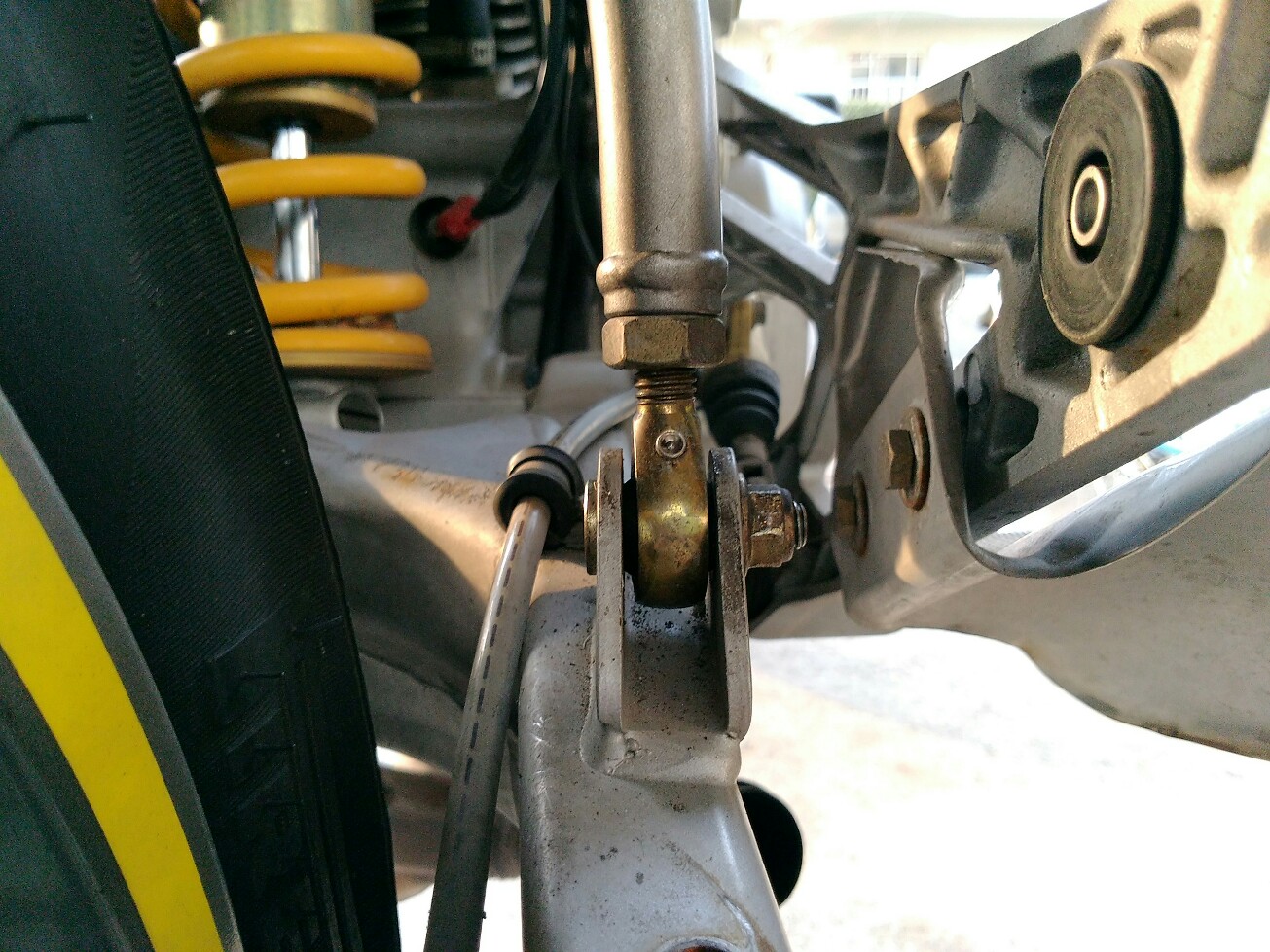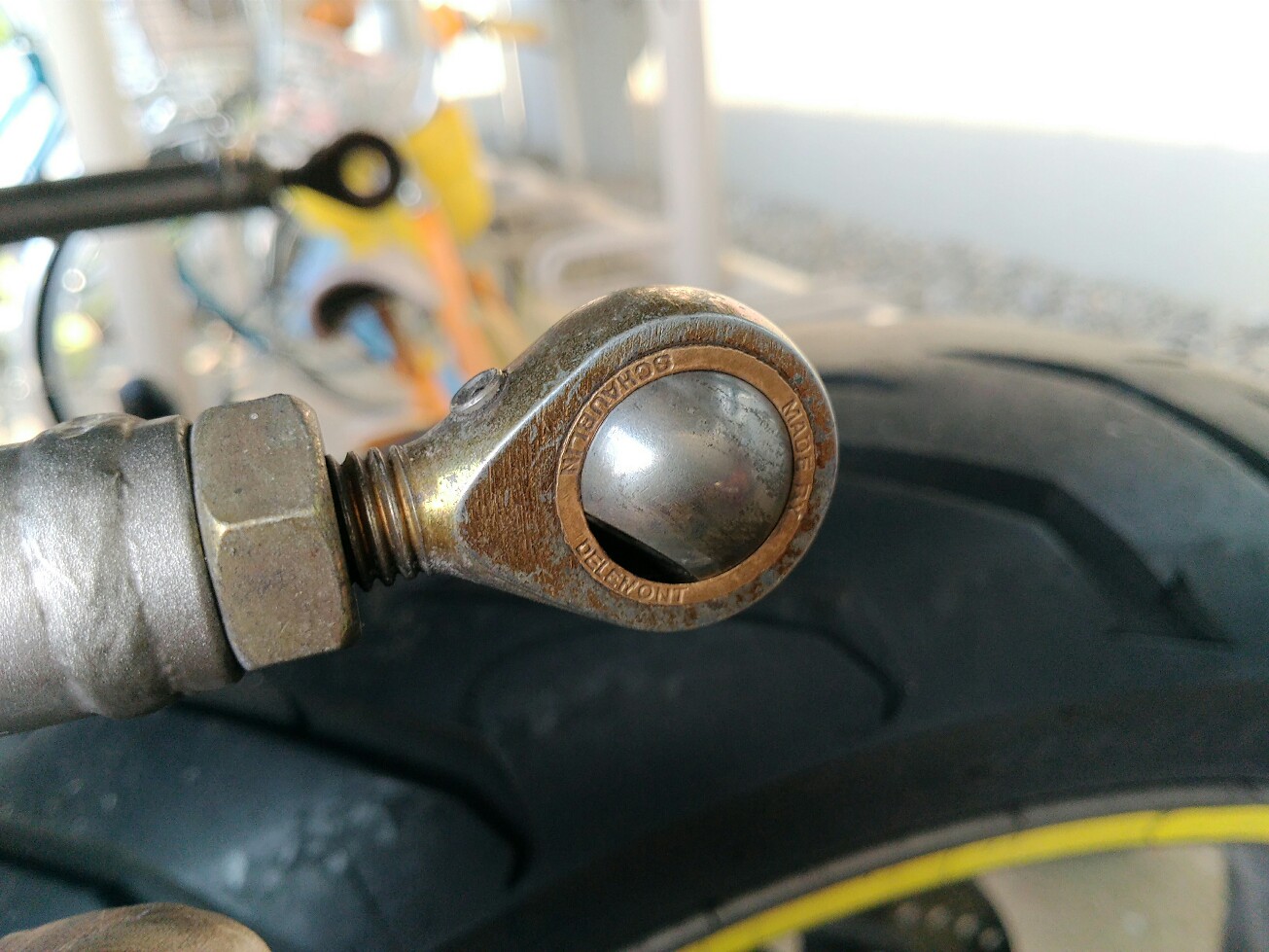 ネットで調べるとアームの先にあるピロボールのグリスが切れると異音が出るようなので、自分で外せるか確認します。