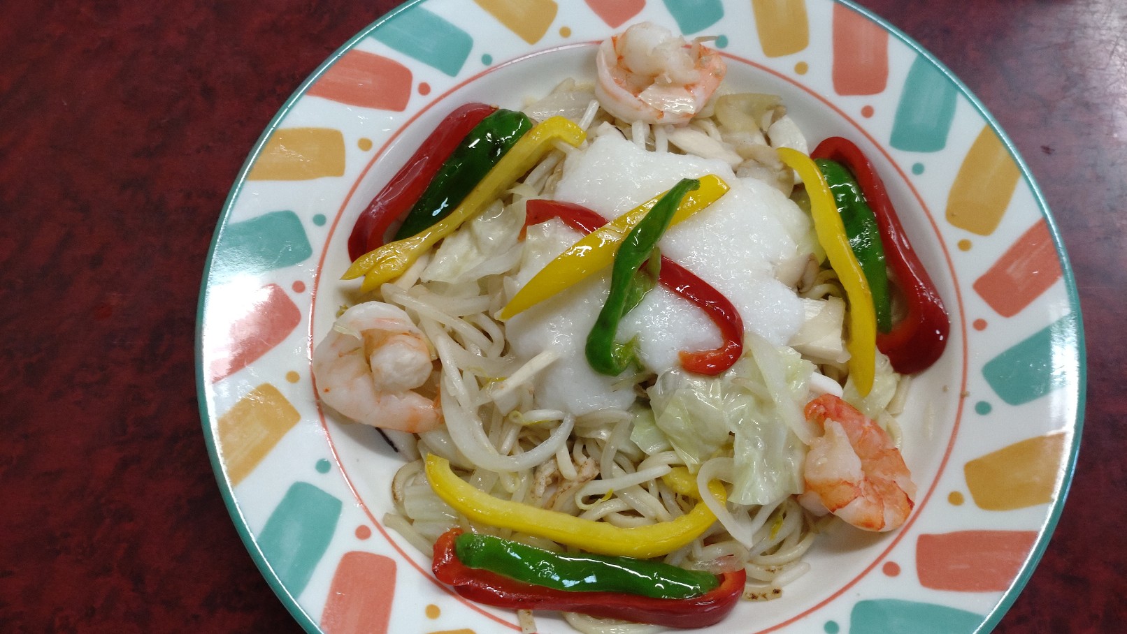 エビ、ベビーホタテも入っている海鮮塩焼きそば。