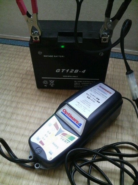 Optimate3で充電。コンセントに挿すだけで、明日まで放置。