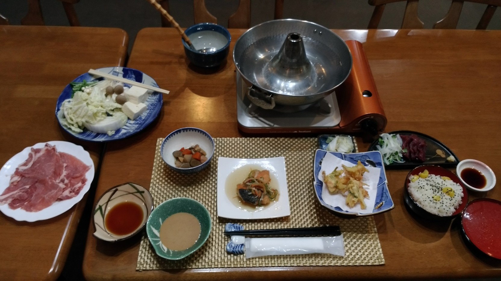 夕食はぼくち蕎麦とみゆきポークのしゃぶしゃぶと馬刺し。